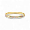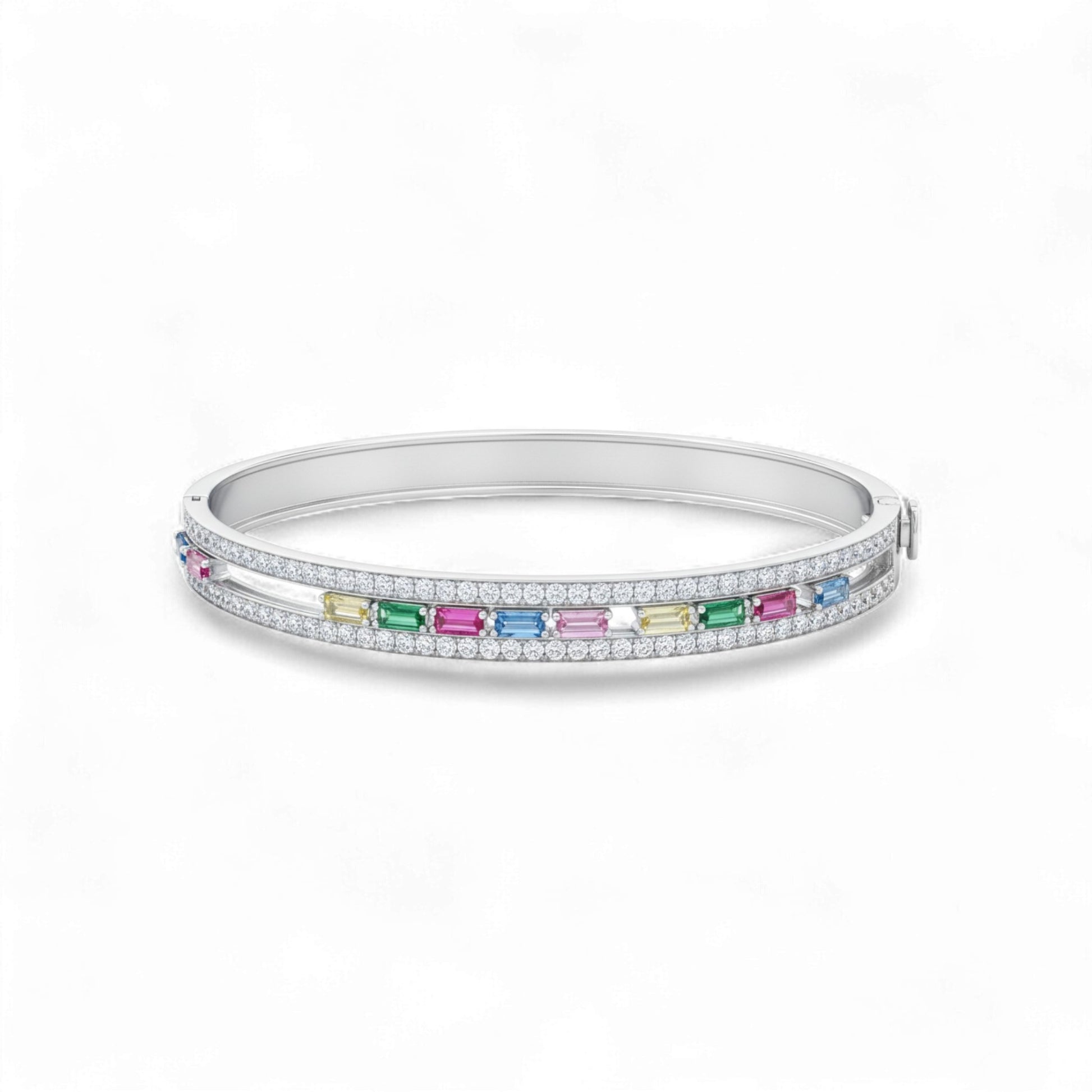 Where brilliance meets motion, the Aeris Diamond and Sapphire Bracelet captures the essence of elegance in motion. This exquisite design features a sleek double-row of round-cut diamonds framing a row of colorful baguette sapphires in blue, pink, green, and yellow,  each delicately set to move with a gentle shimmer as you do. Crafted in 18KT gold, it radiates versatility and sophistication, perfect for any occasion.