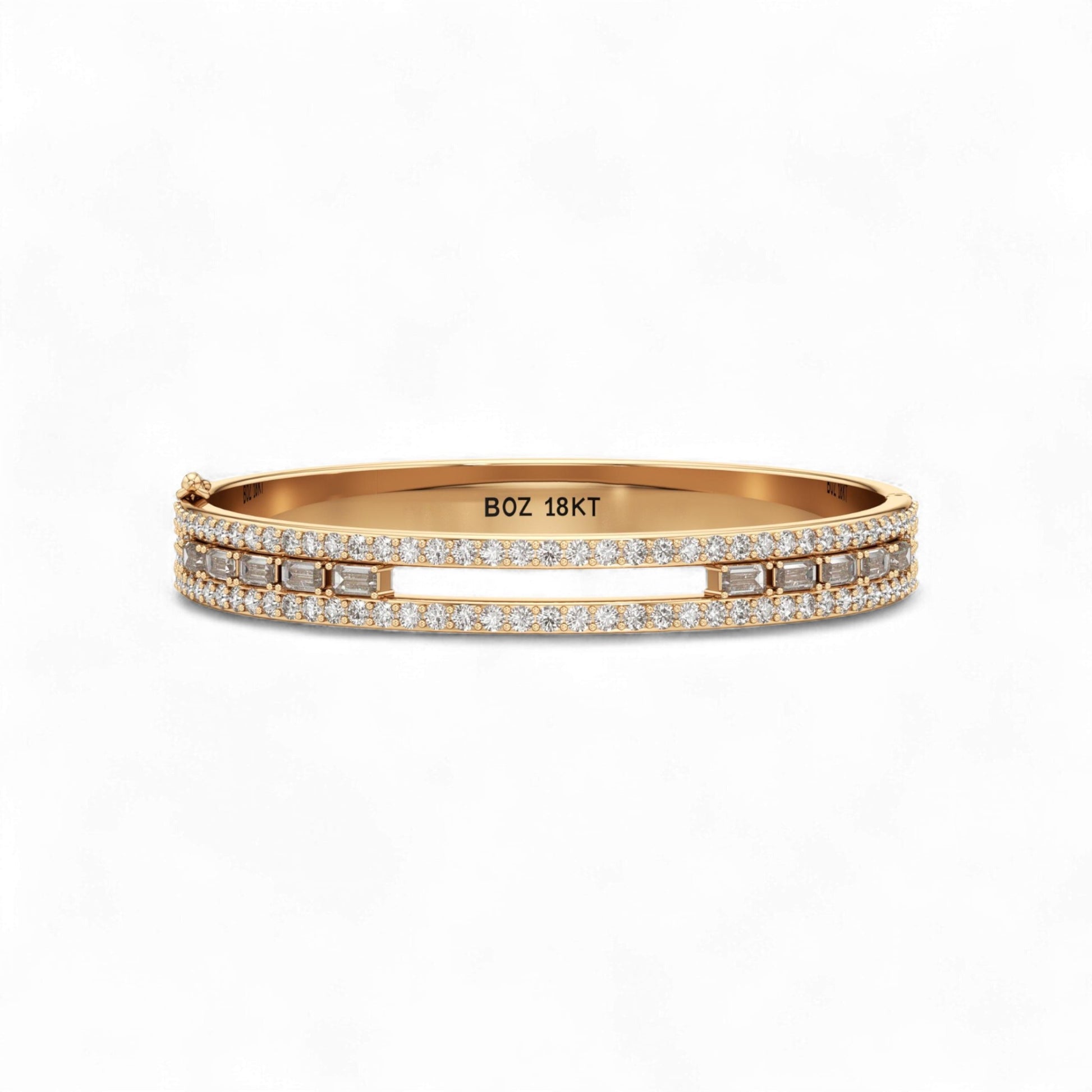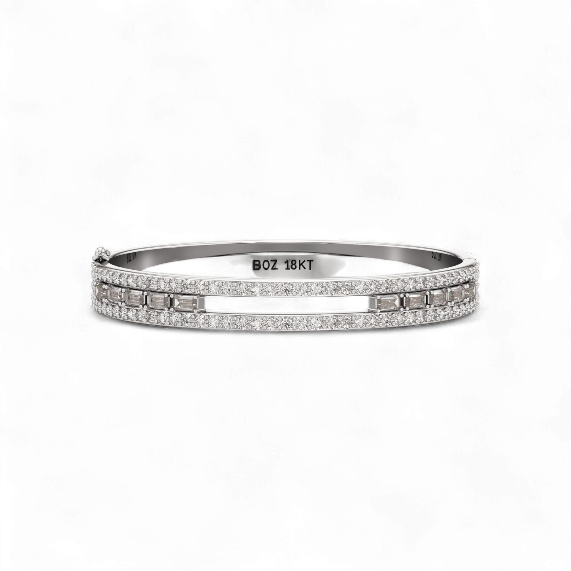 The Aeris Diamond Bracelet captures the delicate balance of movement and radiance. Designed with a sleek double-row structure, it features round-cut diamonds that sparkle endlessly and a center line of baguette diamonds, each small stone crafted to move gracefully with every motion. The result is a bracelet that glimmers with life, reflecting light and love from every angle.