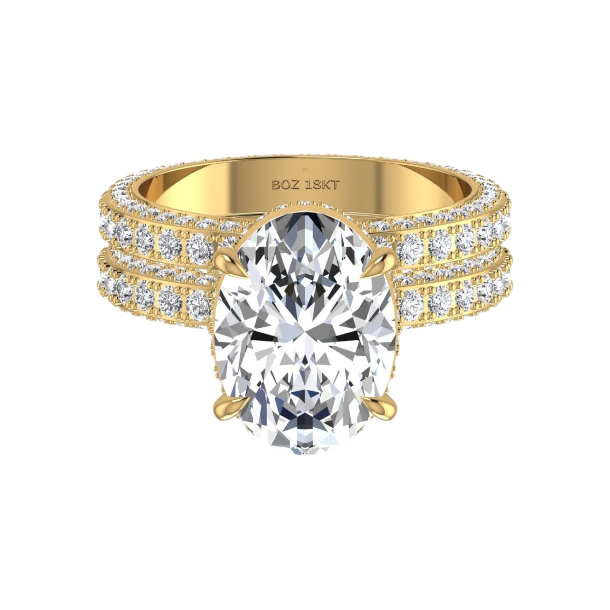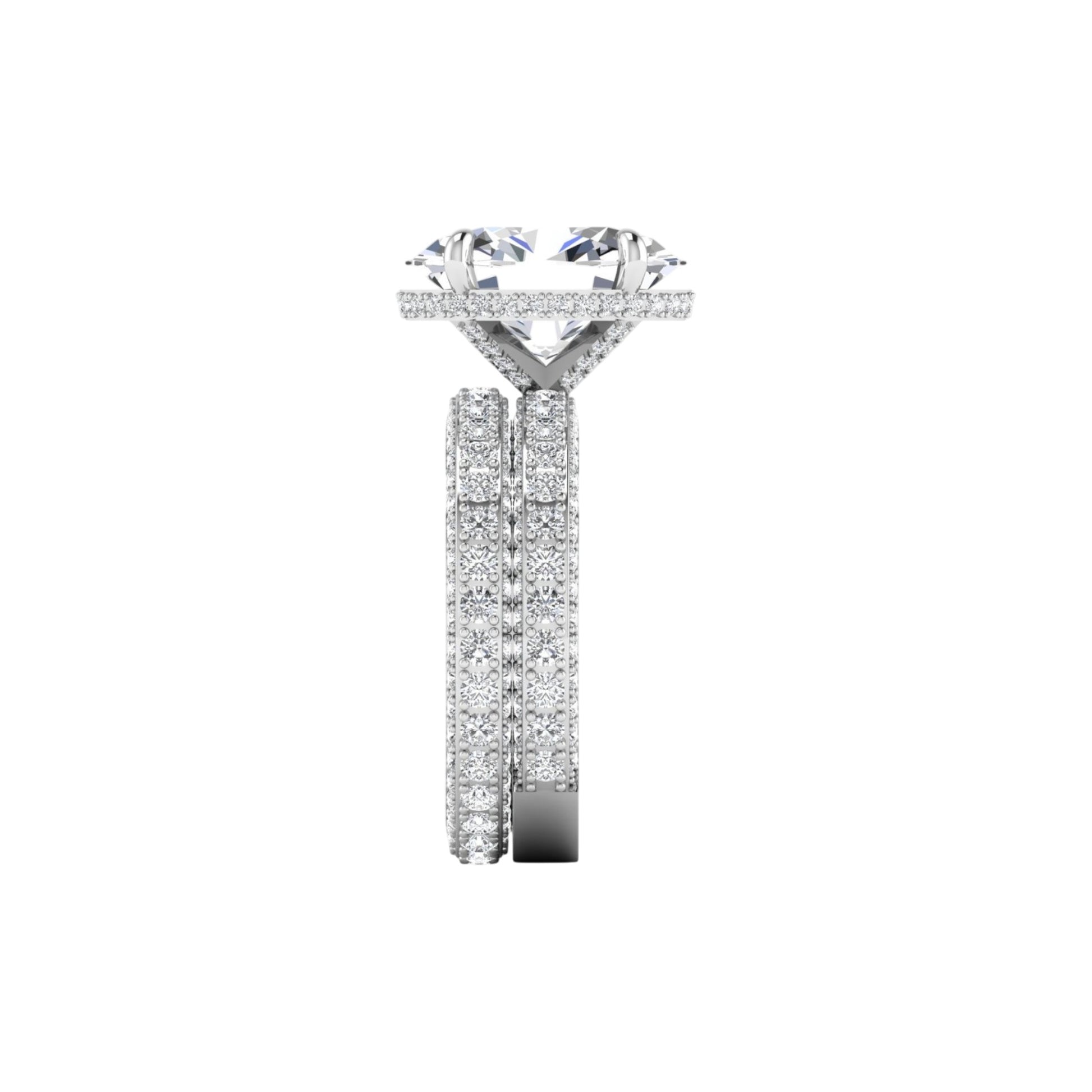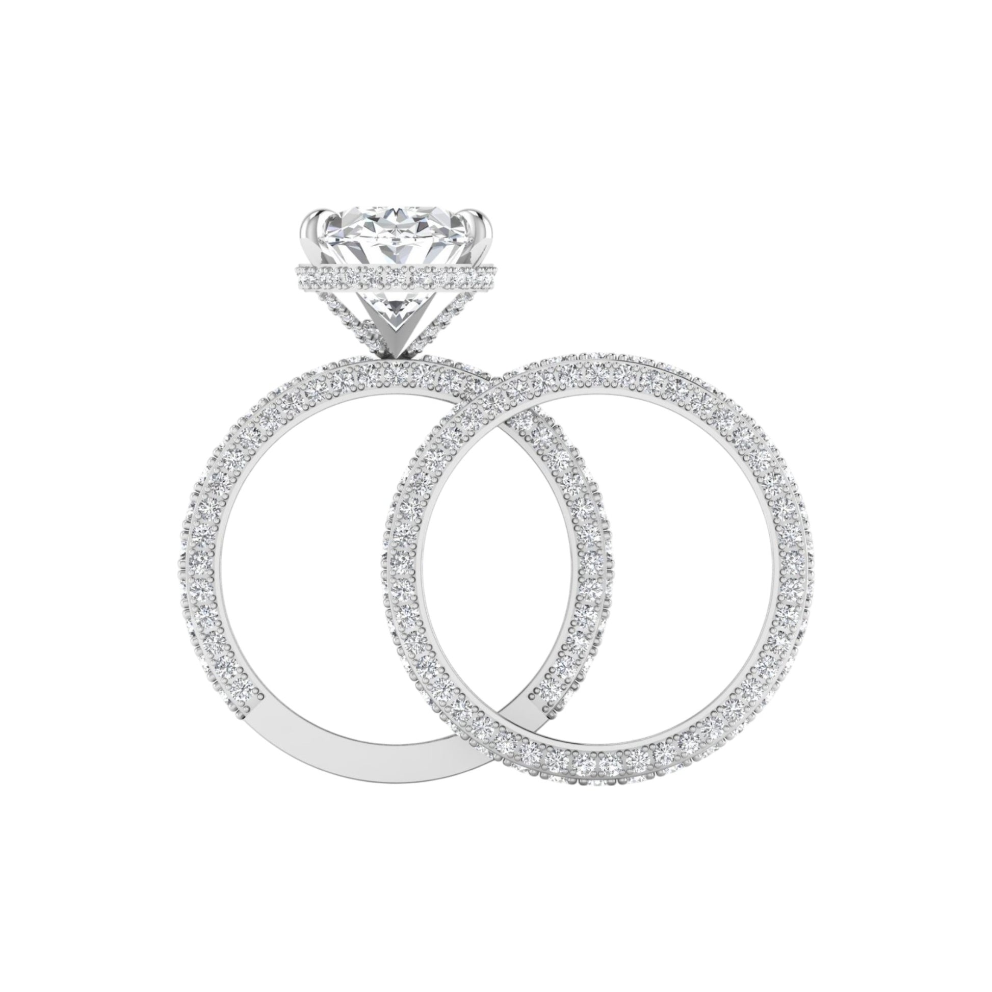 The Amina Oval Cut Diamond Bride Set in 18 Karat Gold is a dazzling celebration of romance and elegance, showcasing a brilliant oval-cut natural diamond as its centerpiece, set in a classic four-prong design. Handcrafted in luminous 18K gold, the engagement ring is complemented by a diamond-studded band and a perfectly matching wedding ring, both adorned with pavé-set diamonds for continuous sparkle. The oval cut, admired for its graceful silhouette and radiant fire, symbolizes harmony, continuity, and everlasting devotion, making this bridal set the perfect choice for the bride who desires timeless luxury and a love that shines endlessly.