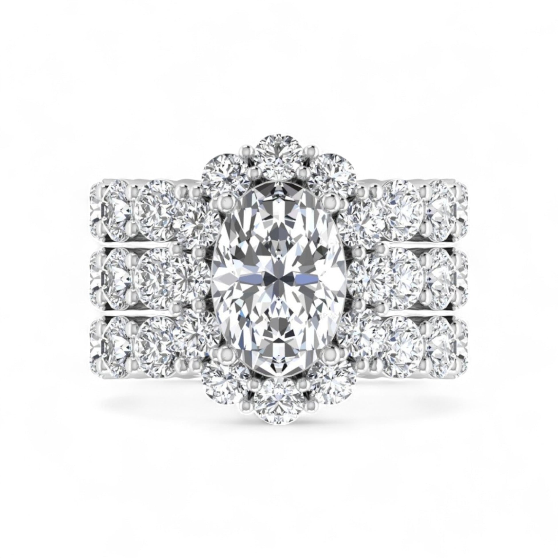Unrivaled in brilliance and luxury, the Jane Oval Certified GIA Certified Natural Pavé Diamonds Bridal Set is designed for the bride who desires nothing less than extraordinary. At its heart, a stunning 3ct GIA certified oval-cut natural diamond radiates timeless elegance, symbolizing harmony, devotion, and grace. Surrounding the centerpiece, rows of meticulously set round brilliant natural diamonds create a bold, full-bodied brilliance that captures light from every angle.