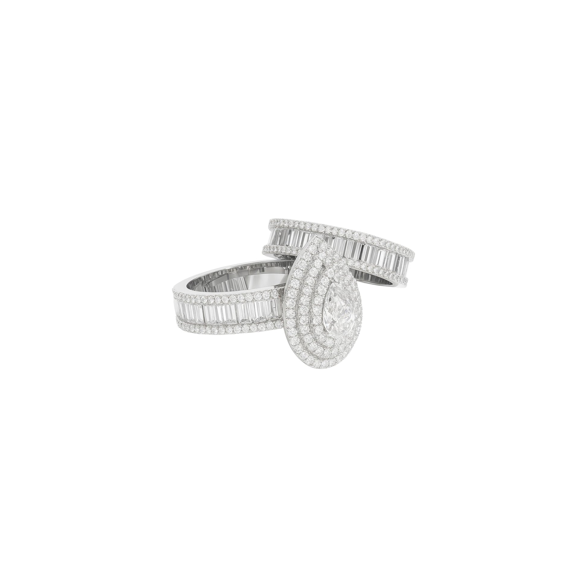 The Doris Pear Cut Certified Pavé Diamonds Bride Set in 18 Karat Gold is a radiant masterpiece of elegance and devotion, featuring a stunning pear-cut center diamond embraced by a brilliant double halo of pavé-set round diamonds. Handcrafted in luminous 18K gold, the set is further elevated with rows of channel-set baguette diamonds along the band, creating a captivating blend of fire and sophistication. The pear cut, often called the teardrop of joy, symbolizes romance and enduring love, while the intricate detailing of this design reflects the strength and brilliance of a forever bond. Crafted for the bride who desires both grandeur and timeless elegance, the Doris Bride Set is a dazzling testament to love that shines endlessly.