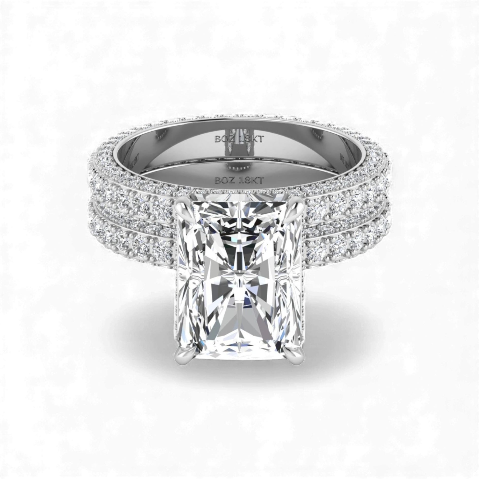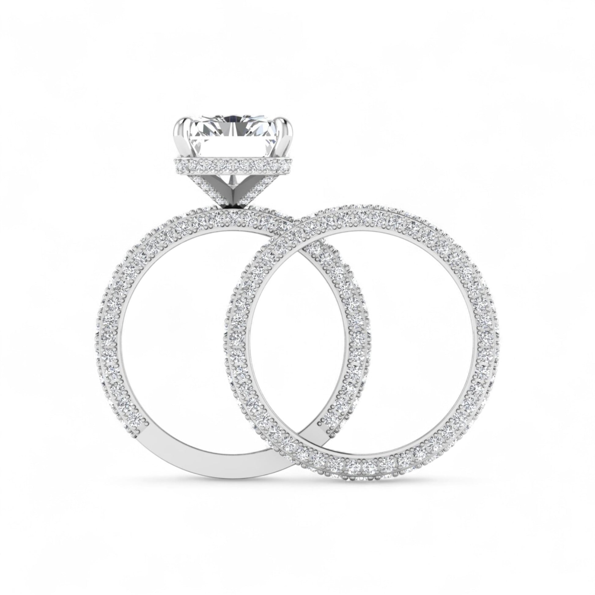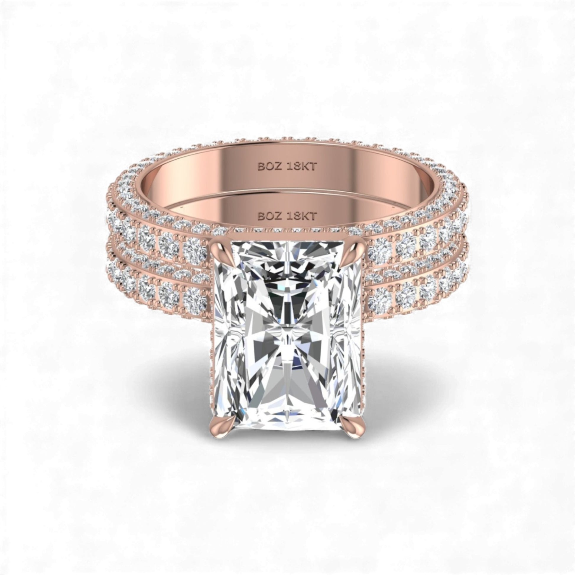 Dazzling and refined, the Amina Radiant Cut Moissanite Bride Set is designed to capture the brilliance of true love. Handcrafted in luxurious 18KT gold, the engagement ring features a radiant-cut moissanite center stone, celebrated for its fire and clarity. Surrounding it, pavé-set natural diamonds along the band add layers of sparkle, while the perfectly matched wedding band completes the set in flawless harmony.