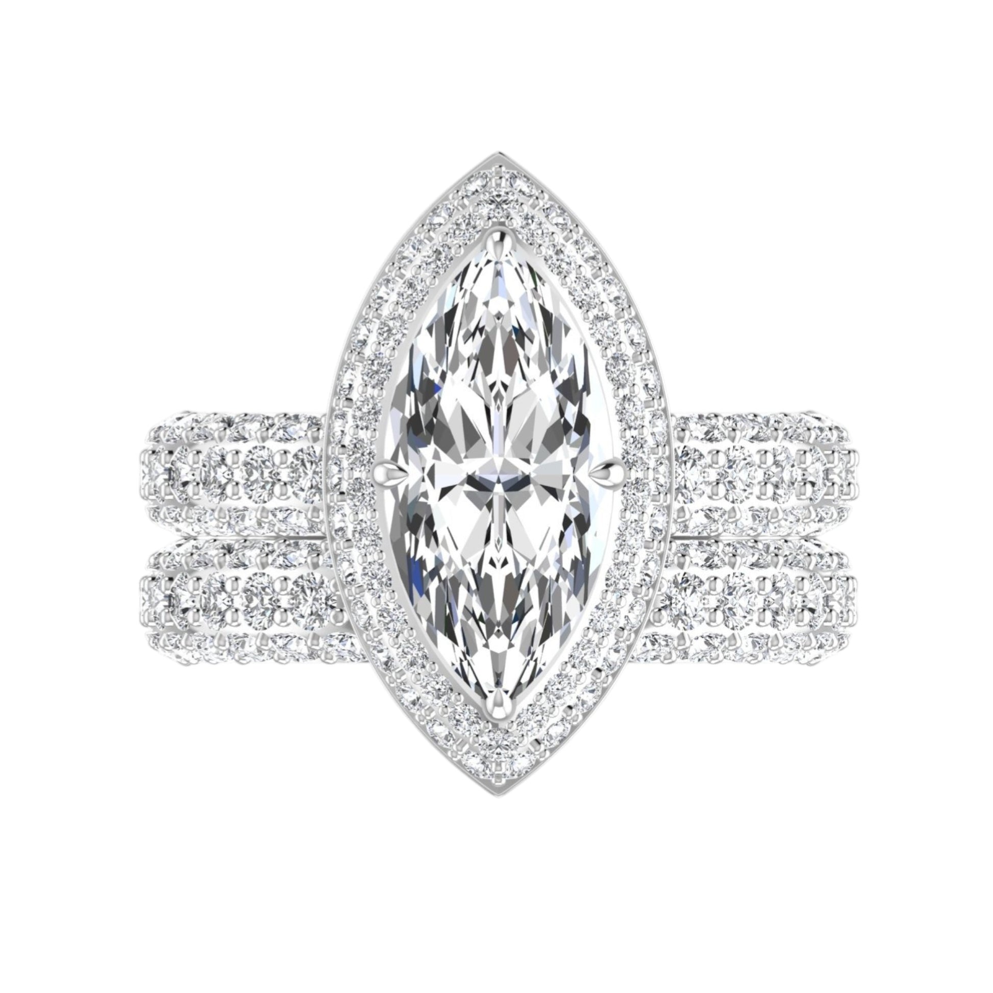 Elegant, radiant, and unforgettable, the Amy Marquise Cut Lab Grown Diamond Bride Set in is designed to celebrate a love that stands apart. Crafted in warm 18 karat gold, this breathtaking bridal set features a striking marquise-cut lab grown diamond at the center, framed by a delicate halo of brilliant accents that enhance its elongated silhouette and fire. The engagement ring is paired with a perfectly matched diamond band, both adorned with finely set diamonds that create seamless sparkle and refined symmetry. The cohesive design delivers brilliance from every angle while maintaining a graceful, modern profile.