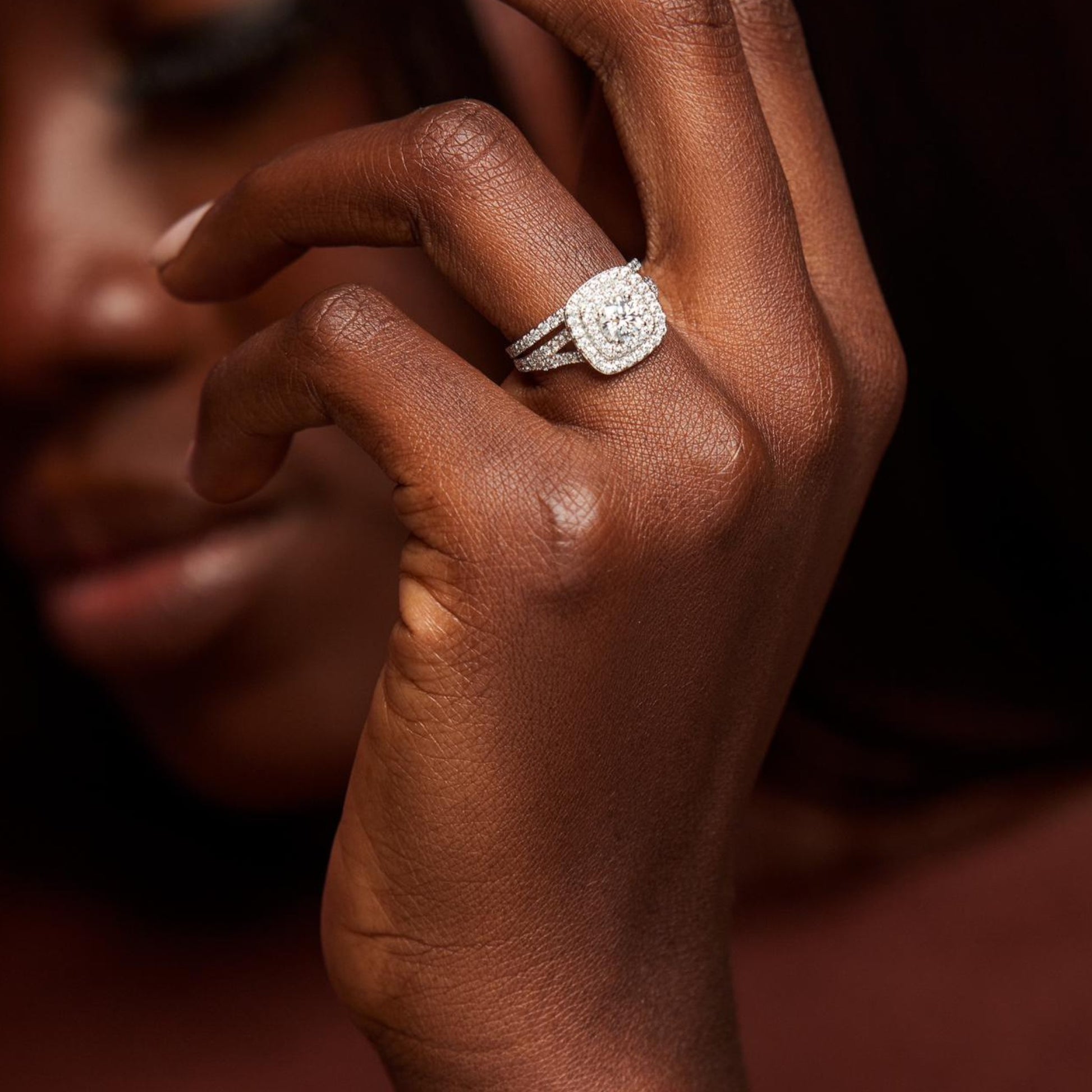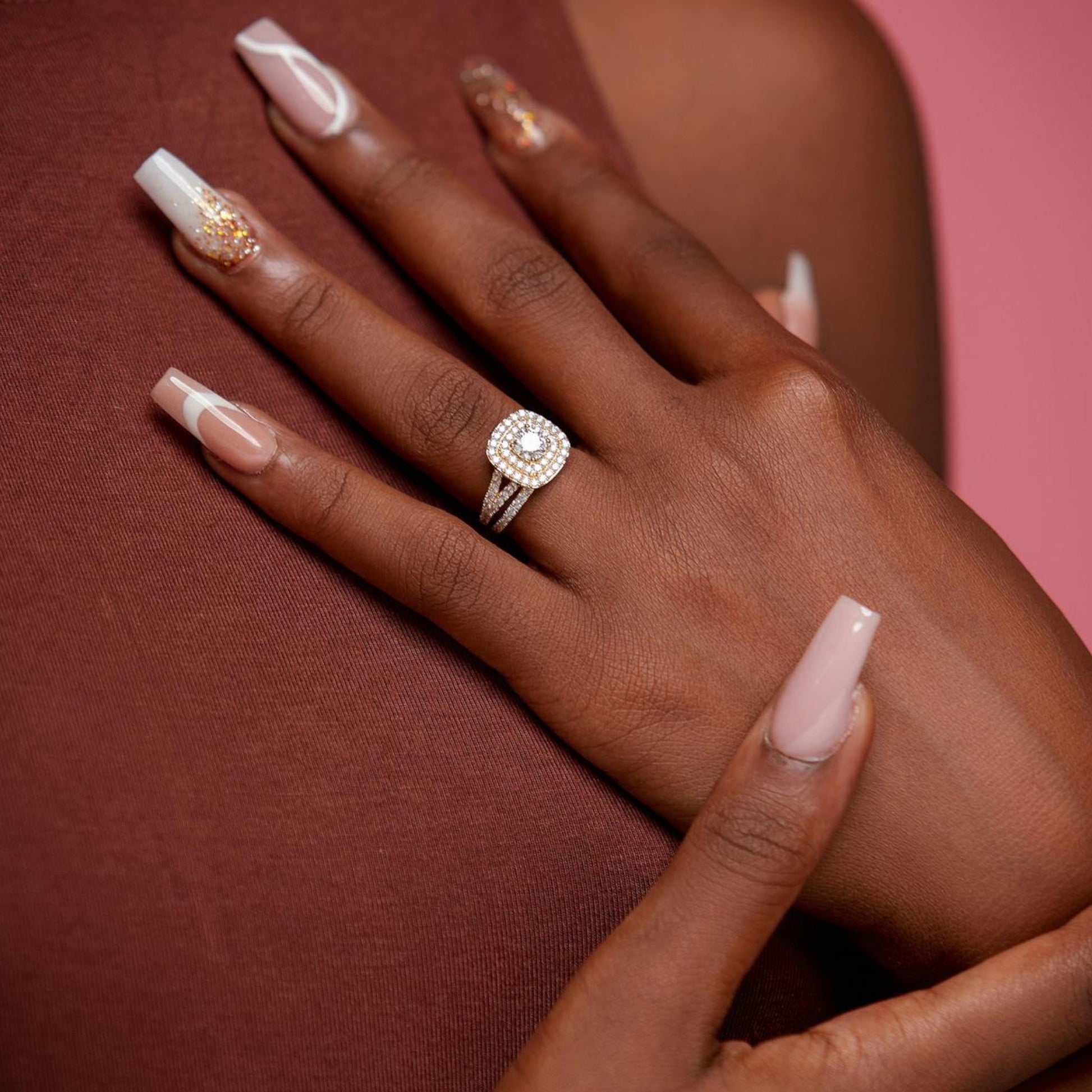 The Audre Round Cut Natural Diamonds Cluster Bride Set is a radiant masterpiece of brilliance and devotion, featuring a round-cut center diamond surrounded by a breathtaking cushion-shaped cluster of halos that magnify its sparkle. Handcrafted in luminous 18KT gold, the engagement ring’s split shank is adorned with pavé-set diamonds for added fire, perfectly paired with a matching wedding band that completes the look with timeless harmony. The round cut embodies eternal love and unity, while the intricate cluster design symbolizes the strength and beauty of a love that grows brighter with every moment.
