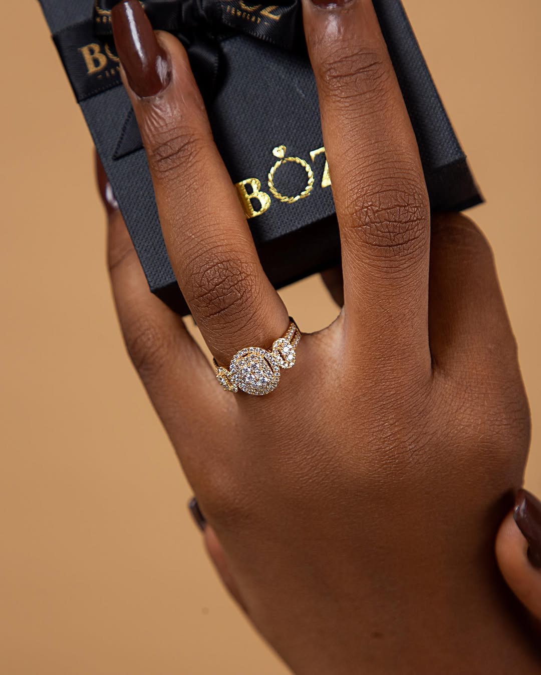 The Regina Oval Cut Natural Diamond Cluster Bride Set is a regal masterpiece of brilliance and devotion, showcasing an oval-shaped cluster of natural diamonds surrounded by layered halos that magnify its radiance. Handcrafted in opulent 18K gold, the engagement ring’s bold triple-stone-inspired design sparkles with pavé-set diamonds that extend along the band, perfectly paired with a matching wedding band for timeless harmony. The oval cut, symbolizing elegance and continuity, reflects a love that grows stronger with time, making this bridal set the ultimate choice for the bride who desires grandeur, luxury, and a forever bond.