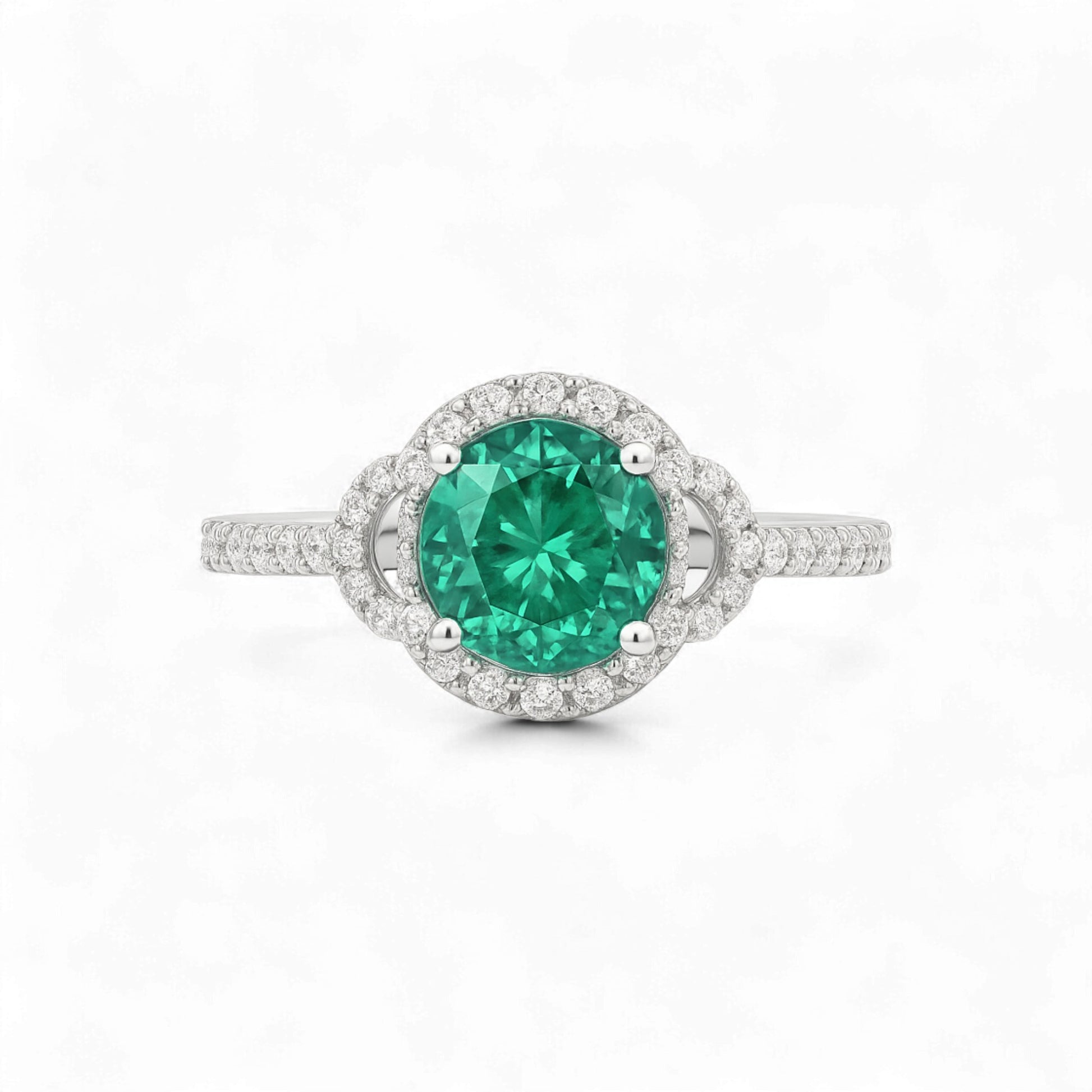 The Aphrodite Engagement Ring is a timeless expression of beauty, grace, and devotion. Handcrafted in luminous 18K gold, this design offers three stunning center stone choices, Blue Topaz, Green Emerald, or White Moissanite. Each is framed by a halo of natural diamond accents and set on a diamond-adorned band, creating brilliance and sparkle from every angle.