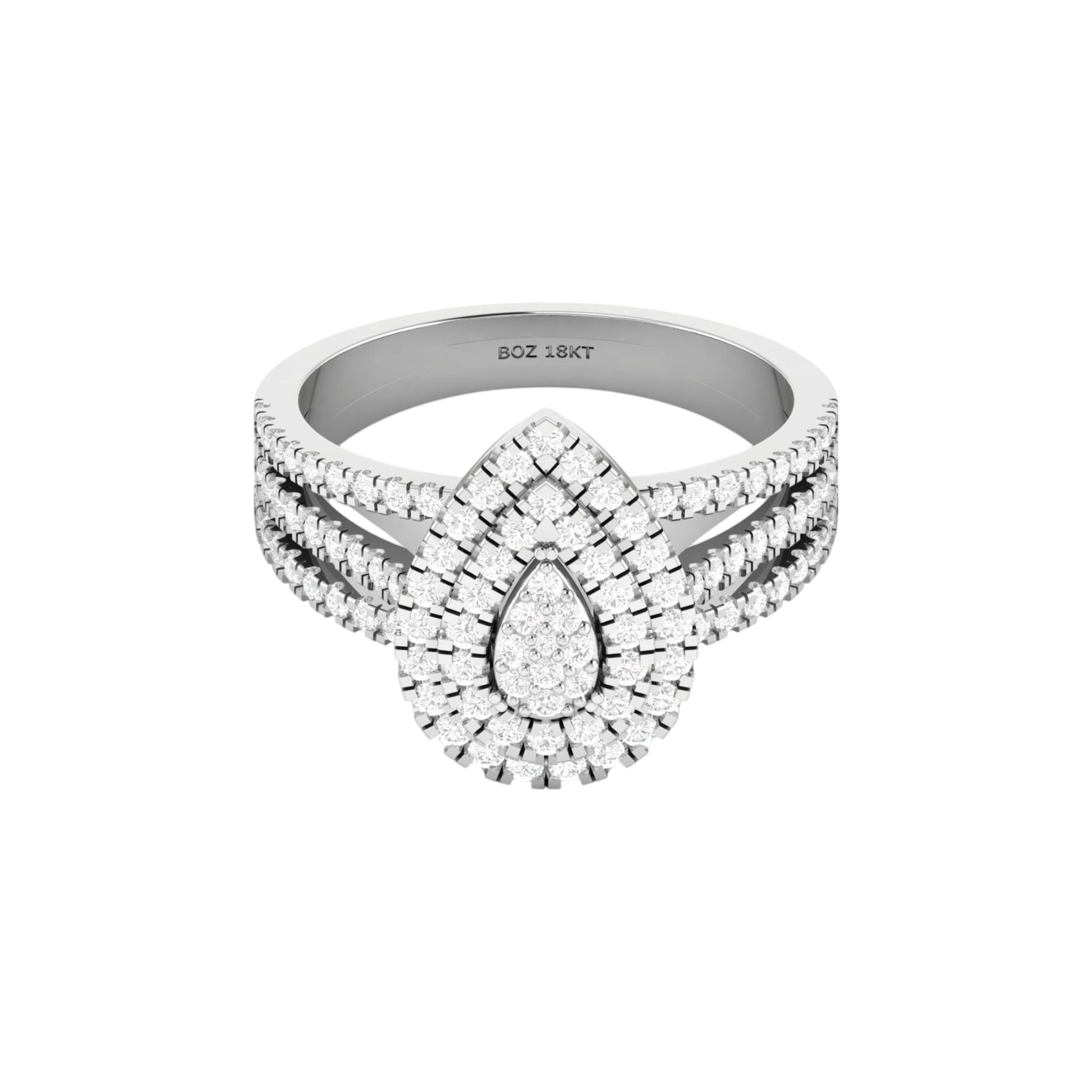 Radiant and graceful, the Lovely Pear Cut Diamond Cluster Engagement Ring is a striking expression of elegance and devotion. Crafted in luminous 18 karat gold, this design features a pear-shaped cluster of natural diamonds, encircled by layers of glittering halos that enhance its brilliance. A triple-split pavé diamond band completes the look, creating a design that dazzles from every angle.