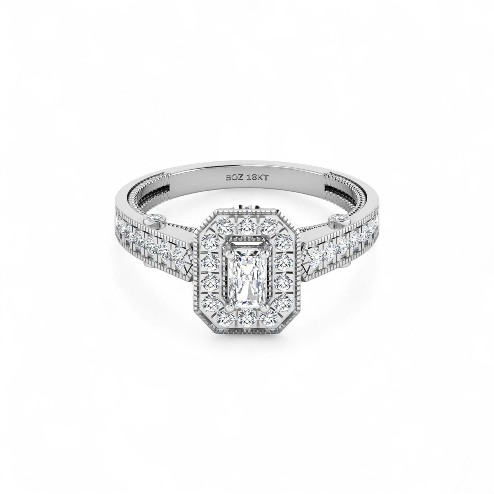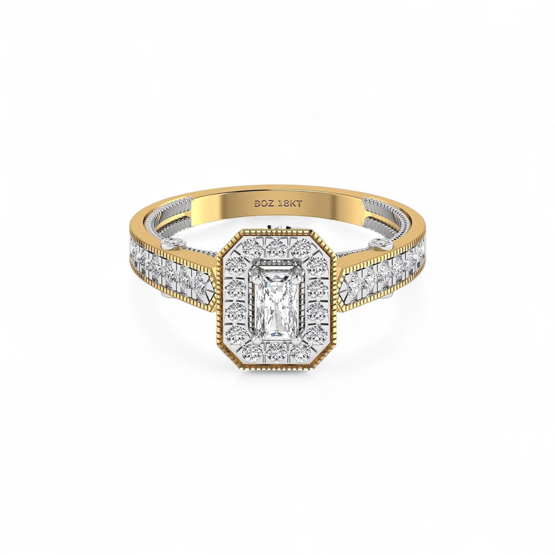 The Nala Radiant Natural Diamond Engagement Ring in 18 Karat Gold is a masterpiece of timeless elegance. Featuring a radiant-cut natural diamond at the center, framed by a bold octagon-shaped halo of brilliant diamonds and a pavé-set band, this design combines striking geometry with refined sparkle. Crafted in polished 18K gold, it’s built to last as beautifully as the love it represents.