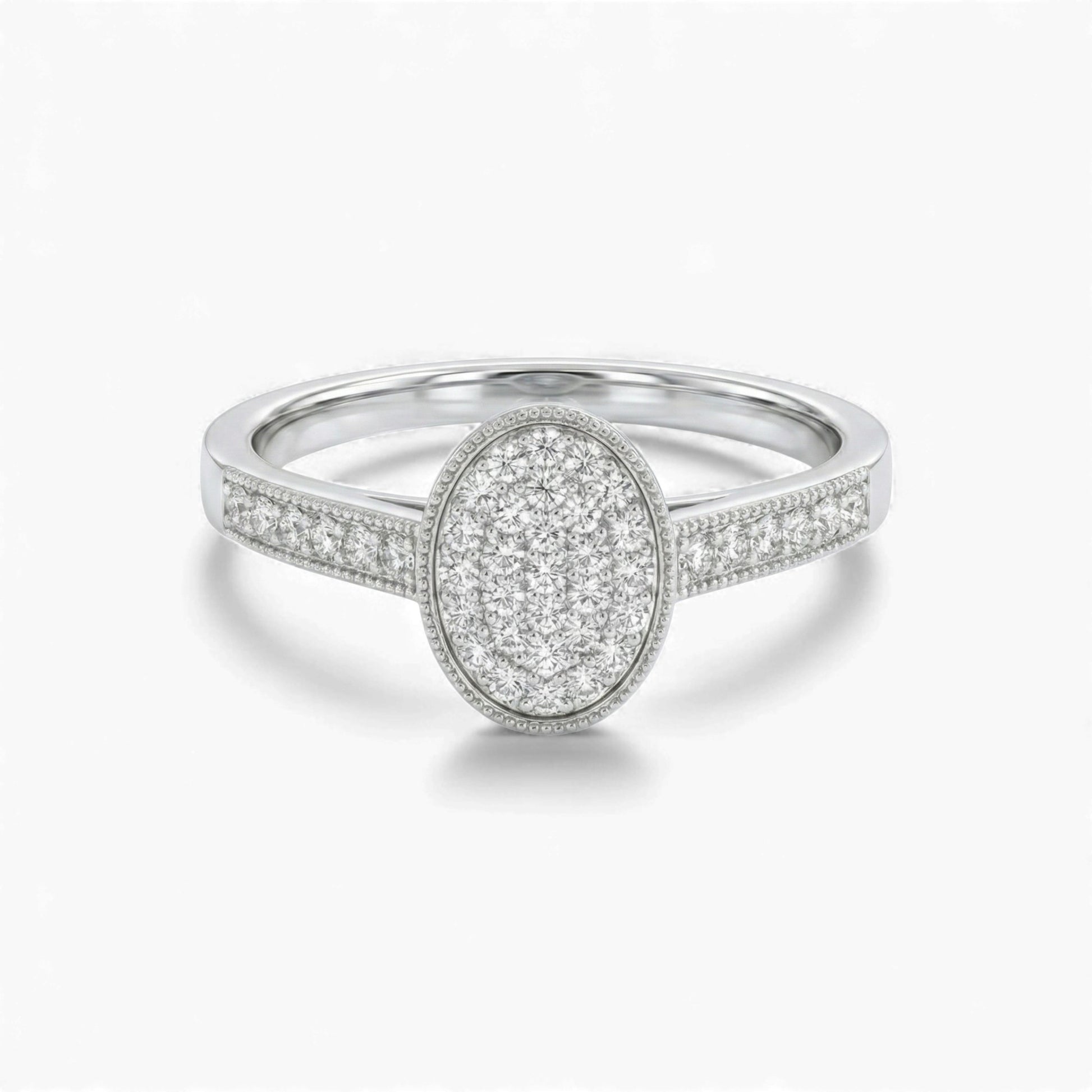 Graceful and radiant, the Pearl Oval Cut Diamond Engagement Ring is a timeless expression of love and elegance. Crafted in luminous 10 Karat gold, this design features a brilliant cluster of diamonds in an oval-cut silhouette, creating a stunning centerpiece that sparkles with every glance. The band, adorned with pavé-set diamonds and fine milgrain detailing, adds depth, sophistication, and vintage charm.