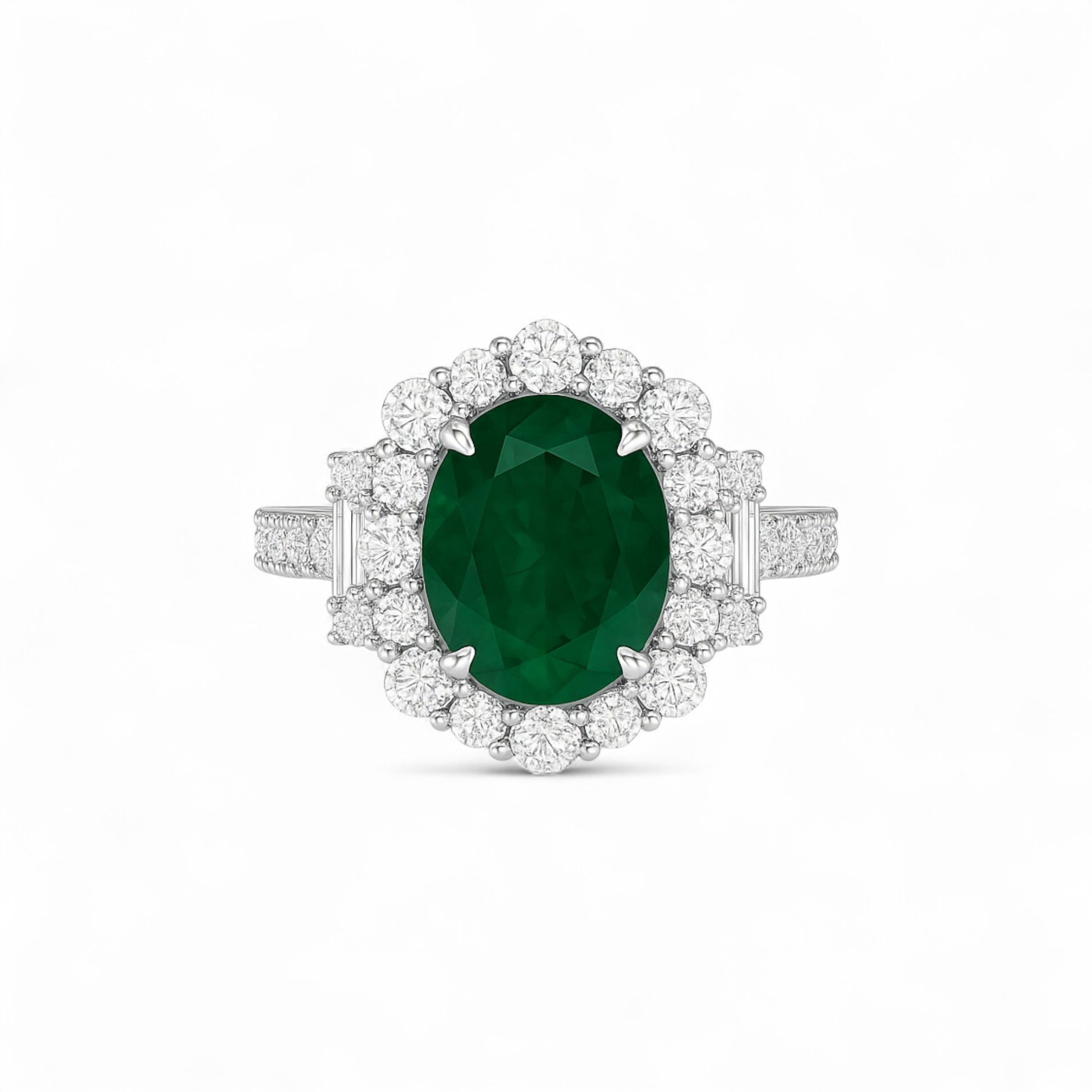 - Center Stone: Oval Cut Emerald Gemstone