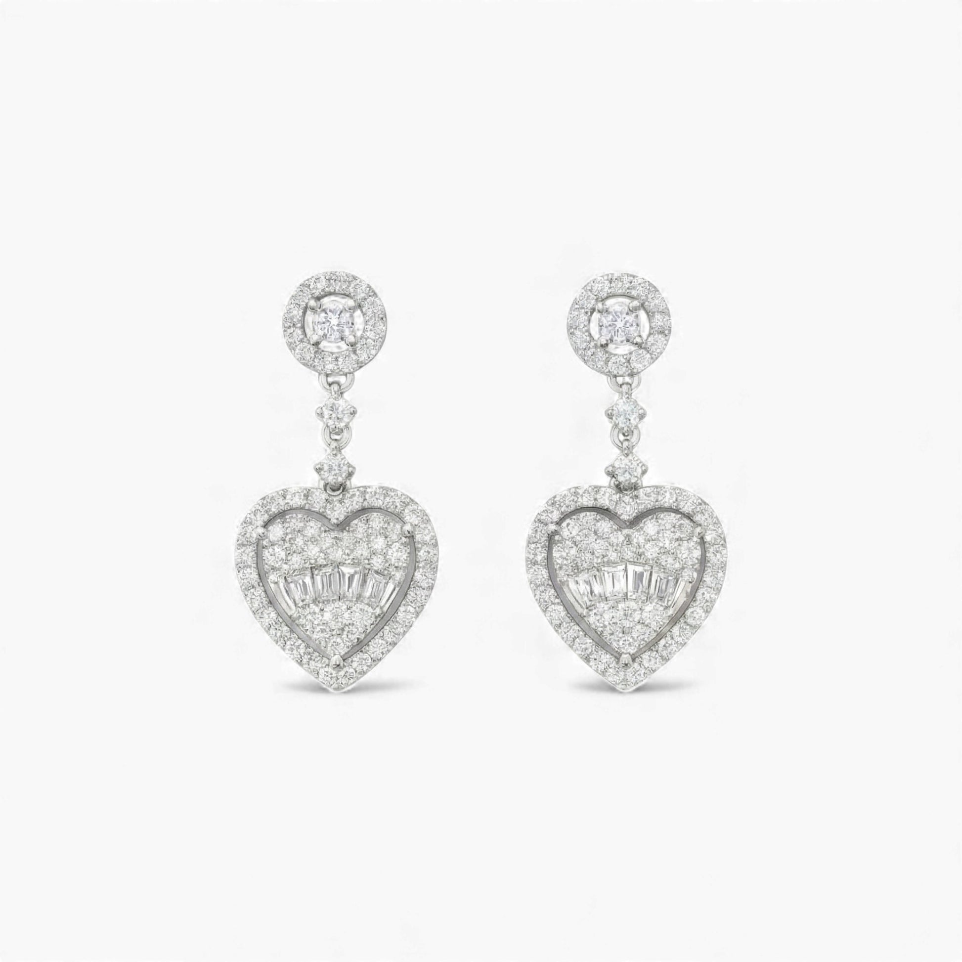 Fall in love with the delicate beauty of our Diamond Drop Heart Earrings, crafted in gleaming 925 sterling silver. Each earring features a brilliant-cut diamond cluster drop leading to a heart-shaped pendant, encrusted with shimmering diamonds and accented by a graceful arc of baguette stones.