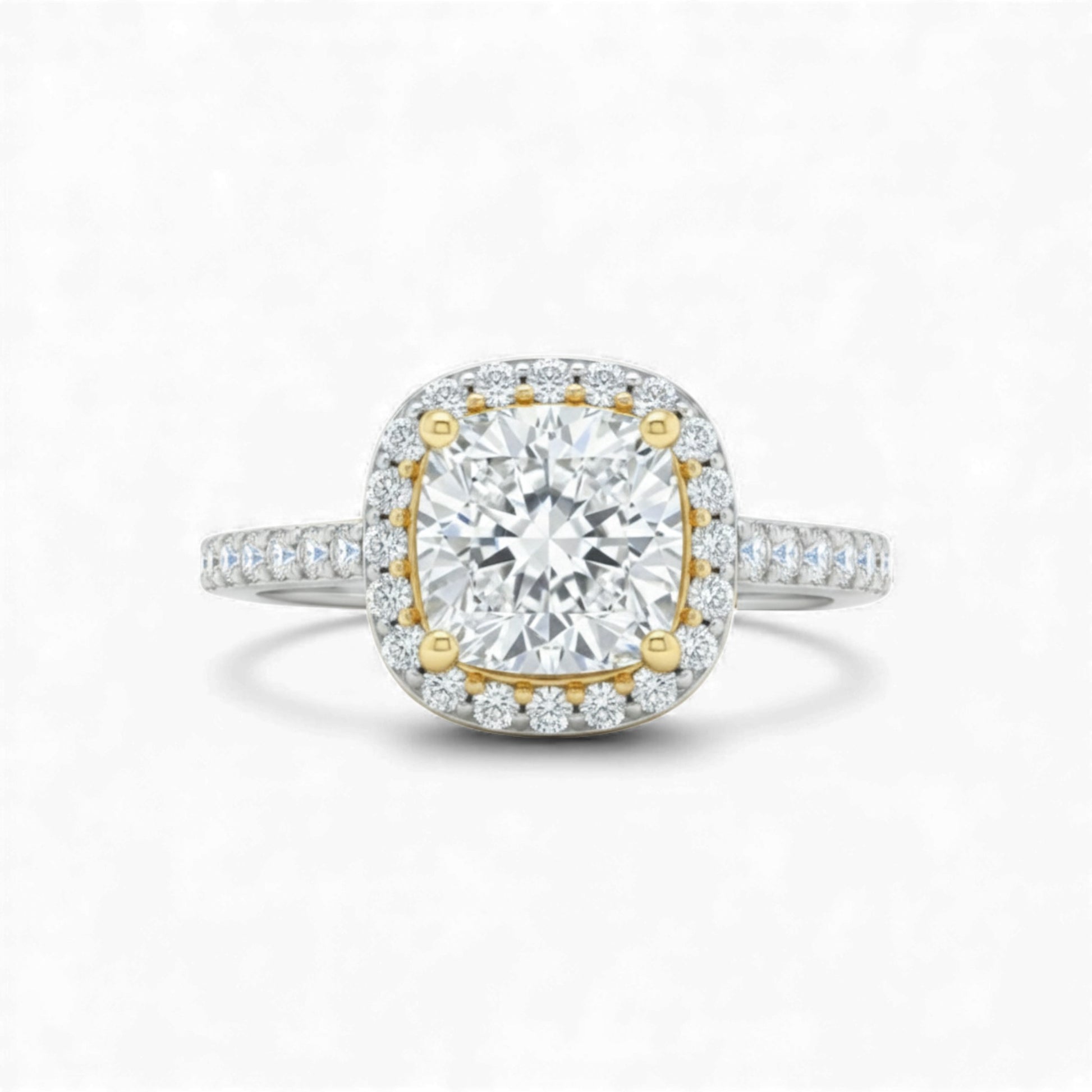 Radiating timeless allure, the Classic Cushion Cut Two Tone Moissanite Engagement Ring captures the essence of enduring elegance. Set in luminous sterling silver, this piece features a cushion-cut moissanite encircled by a halo of golden accents that bring warmth and brilliance to every angle. The dual-tone design creates a stunning balance between modern sophistication and classic romance, making it a ring that turns moments into memories.