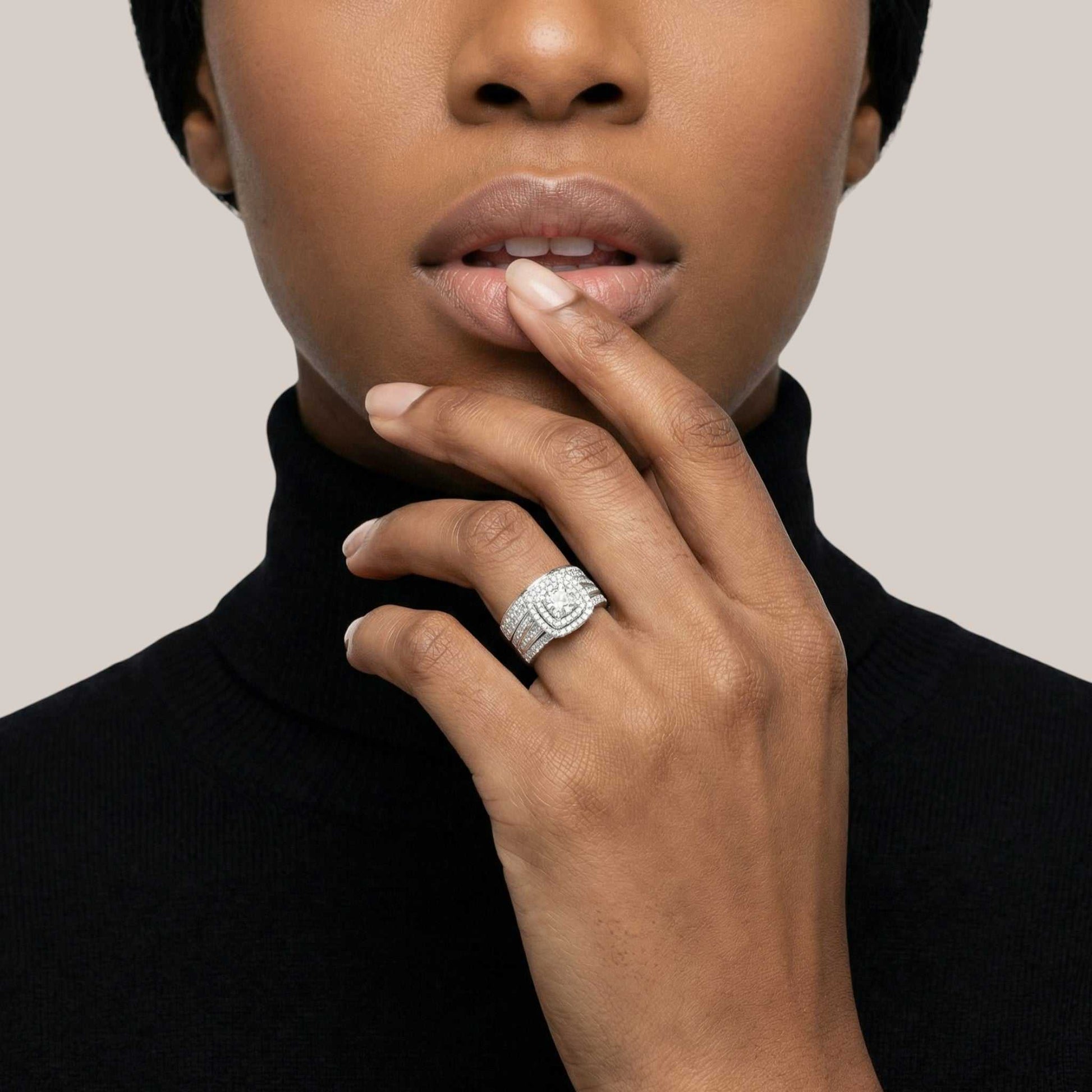 The Omoni Cushion Cut Cluster Natural Diamond Bride Set is a magnificent expression of brilliance and eternal devotion, featuring a cushion-shaped cluster of natural diamonds framed by multiple shimmering halos that magnify its sparkle. Handcrafted in luxurious 18KT gold, the engagement ring’s bold split-shank design glitters with pavé-set diamonds, seamlessly paired with a matching diamond-studded wedding band for a breathtaking finish. The cushion cut, admired for its blend of timeless romance and modern elegance, symbolizes a love that grows brighter and stronger with every moment, making this bridal set the perfect choice for the bride who desires grandeur, sophistication, and a forever promise.