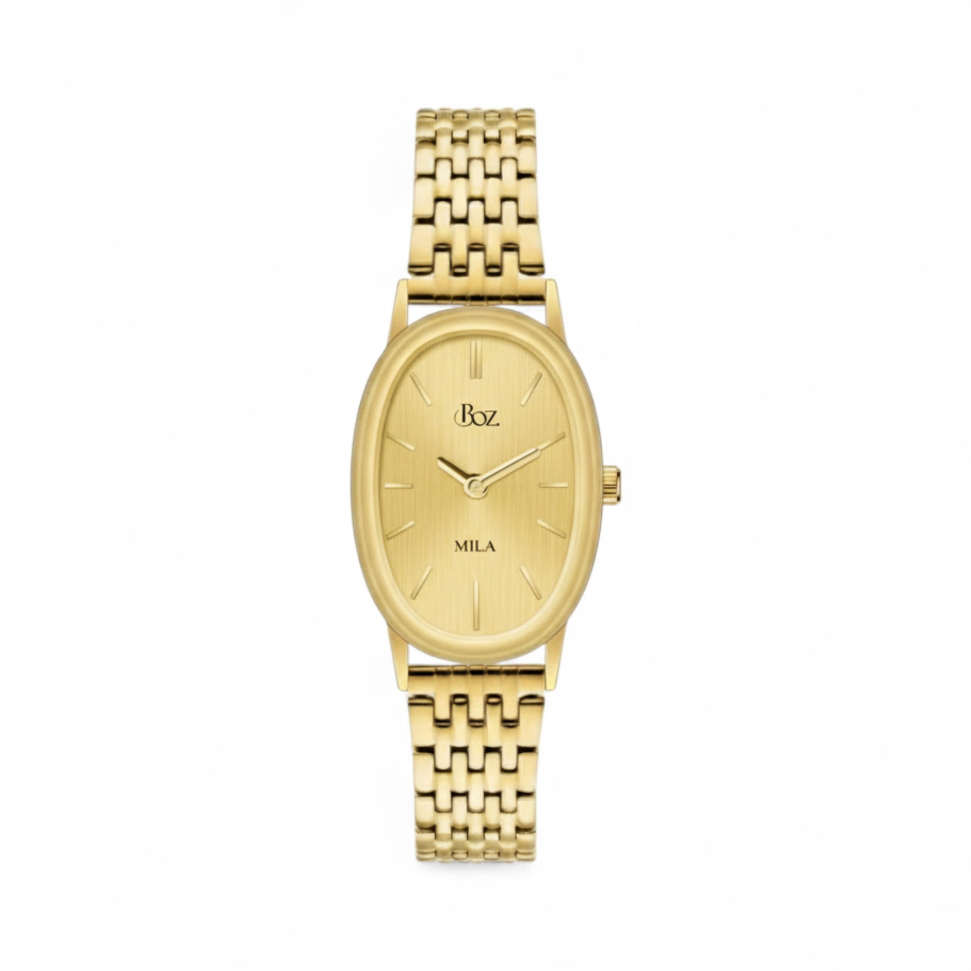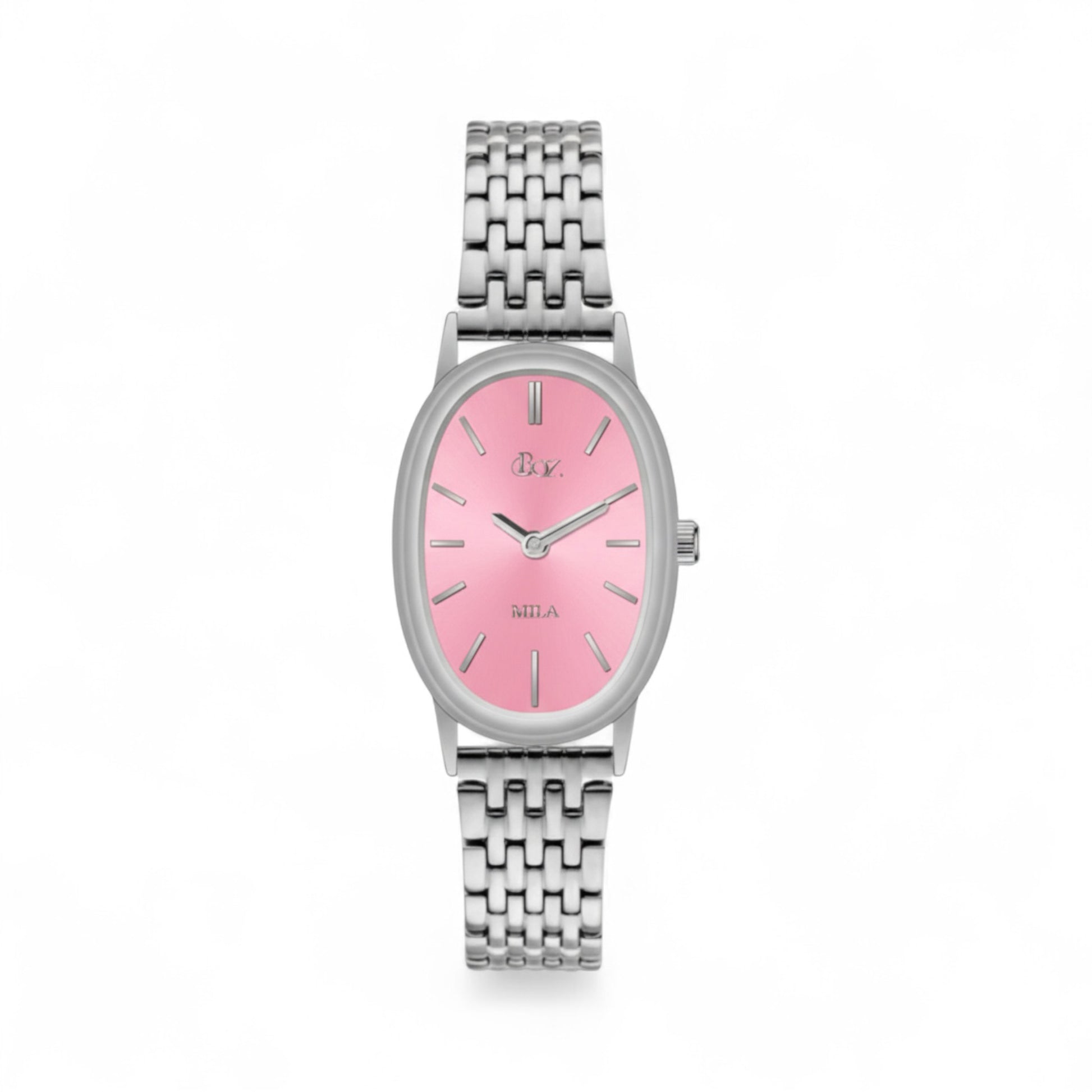 Elegant and timeless, the BOZ Mila watch is designed for the modern woman who appreciates minimalistic sophistication. Featuring a sleek silver-tone oval case and a matching stainless-steel bracelet, this timepiece embodies refined style. The minimalist dial, adorned with slender hour markers and delicate hands, offers a clean and polished look perfect for any occasion. Whether worn alone or stacked with jewelry, the Mila watch adds a graceful touch to your everyday ensemble.