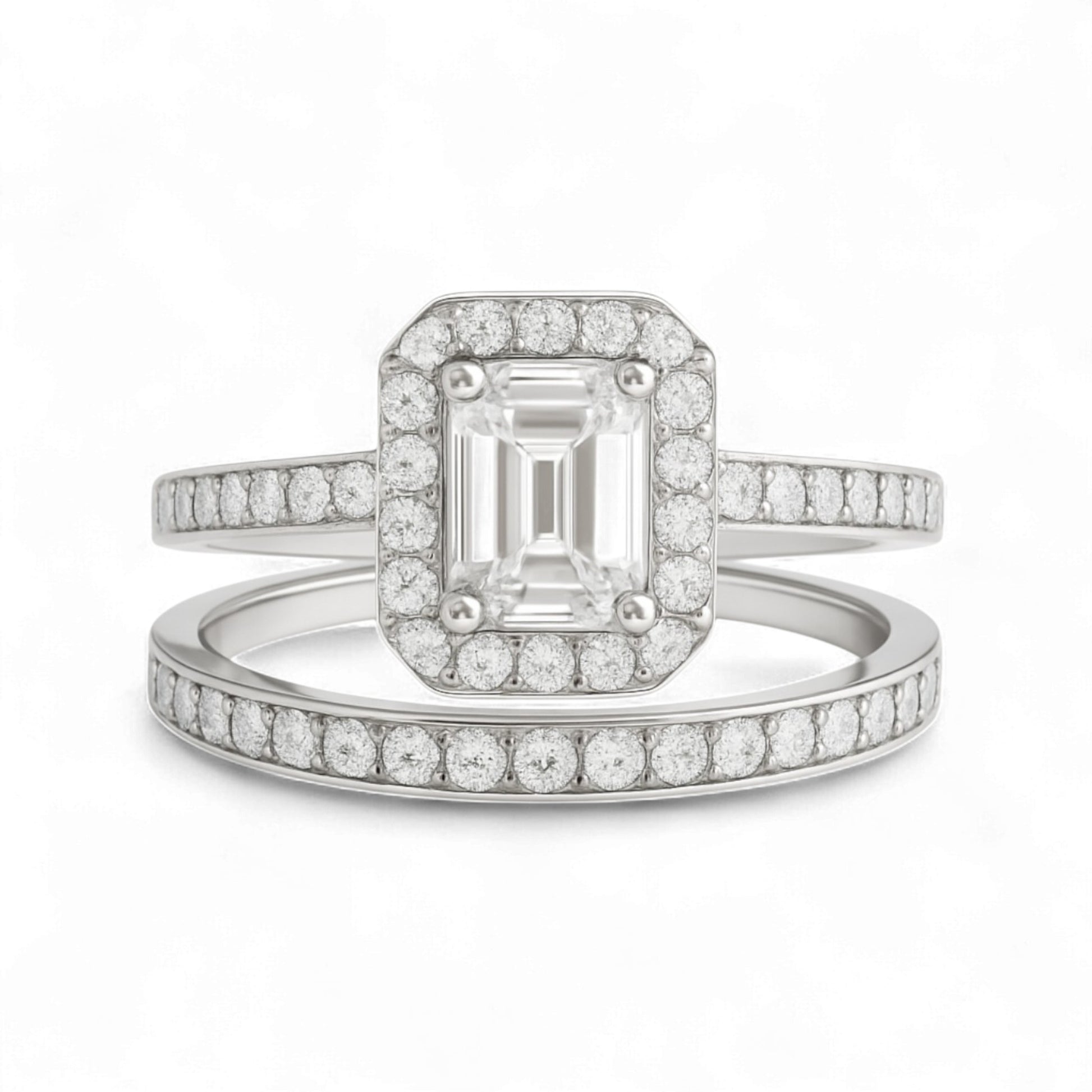 Elegant, timeless, and dazzling from every angle, the Classic Radiant Cut Moissanite and Natural Diamond Bride Set is the perfect union of brilliance and sophistication. Crafted in luxurious 18 Karat gold, the engagement ring features a radiant cut moissanite framed by a halo of natural diamonds, creating a breathtaking sparkle that commands attention. The matching diamond band completes the set, offering harmony, balance, and refined beauty.