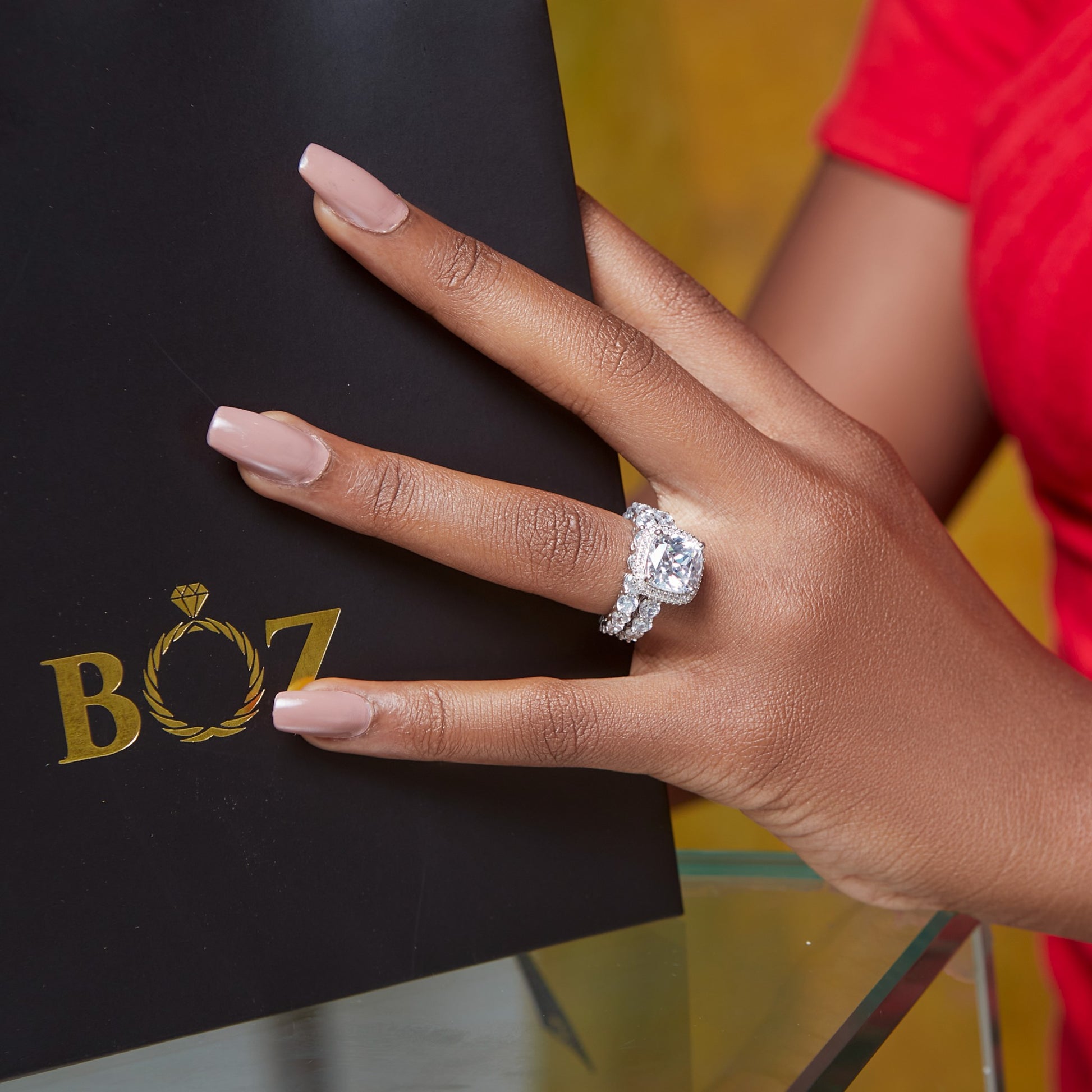 Elegant and radiant, the Eleanor Cushion Cut CZ Bride Set in 925 sterling silver is a stunning celebration of timeless love. The engagement ring features a captivating cushion-cut cubic zirconia at its center, prized for its soft, rounded edges and brilliant sparkle. Framed by a halo of smaller CZ stones and accented along the shoulders, the ring offers a luxurious, light-catching design.