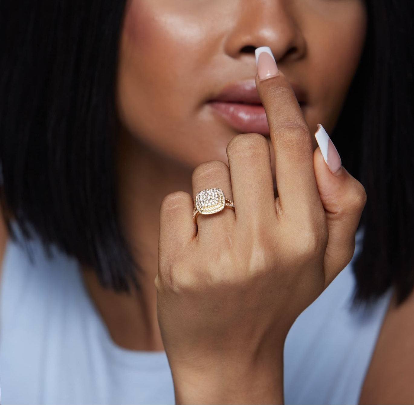 Bold and luminous, the Fancy Cushion Cut Diamond Cluster Engagement Ring is a dazzling expression of elegance and artistry. Handcrafted in radiant 18 Karat gold, this masterpiece features a cushion-shaped cluster of natural diamonds, framed by multiple halos that amplify its fire and brilliance. The pavé-set band completes the design, ensuring a captivating sparkle that glows with every movement.