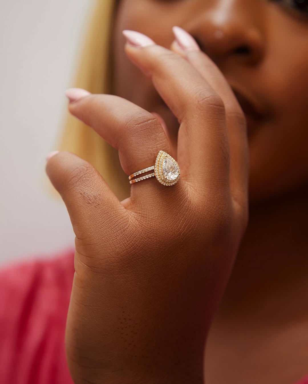 The Mariam Pear Cut Moissanite & Diamond Bride Set in 18 Karat Gold is a radiant celebration of elegance and everlasting love, featuring a brilliant pear-cut moissanite centerpiece framed by a halo of dazzling diamonds that enhance its fire and brilliance. Handcrafted in luminous 18K gold, the engagement ring is paired with a perfectly matched pavé-set wedding band, creating a harmonious balance of sparkle and sophistication. The pear cut, often called the teardrop of joy, symbolizes deep emotion and timeless devotion, making this bridal set the ideal choice for the bride who desires romance, refinement, and a forever treasure.